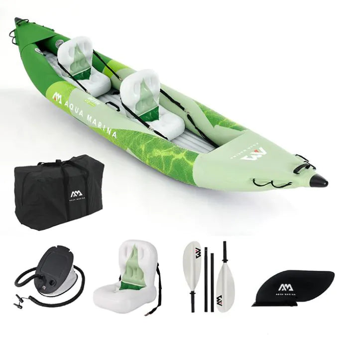 The Aqua Marina Betta HM K0 comes with 9 accessories: foot pump, carrying bag, foot bracket, 2 kayak paddles, 2 inflatable seats, pressure gauge, central fin, repair kit and manual.