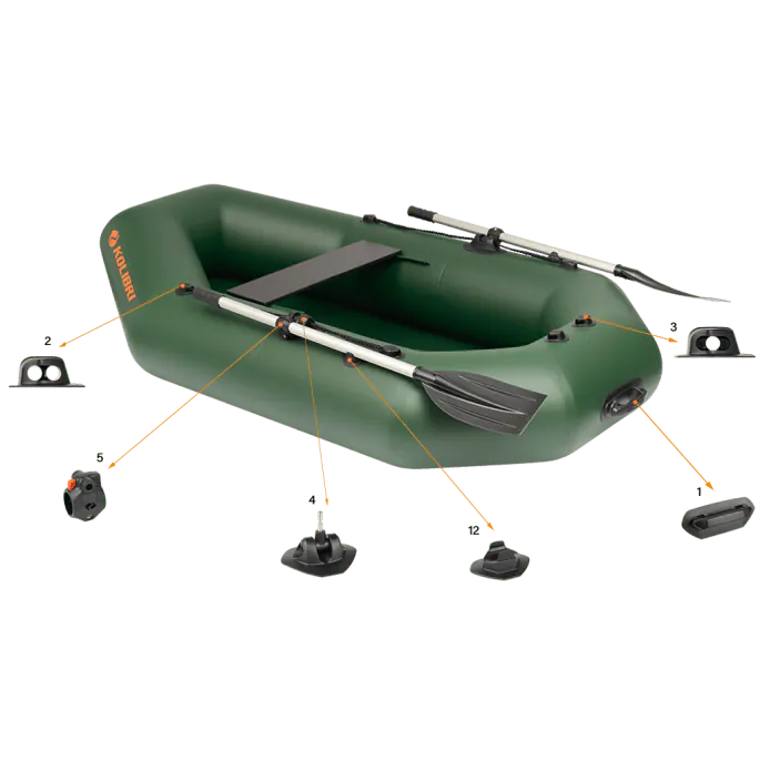 The Kolibri K-220 T carp boat features a handle, integrated oarlocks, and a railing line on each side. Because the K-220 T has two individual floats, you'll always have one floating section even in the unlikely event of a breakdown. This inflatable boat comes standard with a transport bag, paddles, a wooden bench seat, and a hand pump. The Kolibri K-220 T has an optional integrated nylon bumper and can also be equipped with an engine mount. The carp boat can then be equipped with an electric outboard motor.