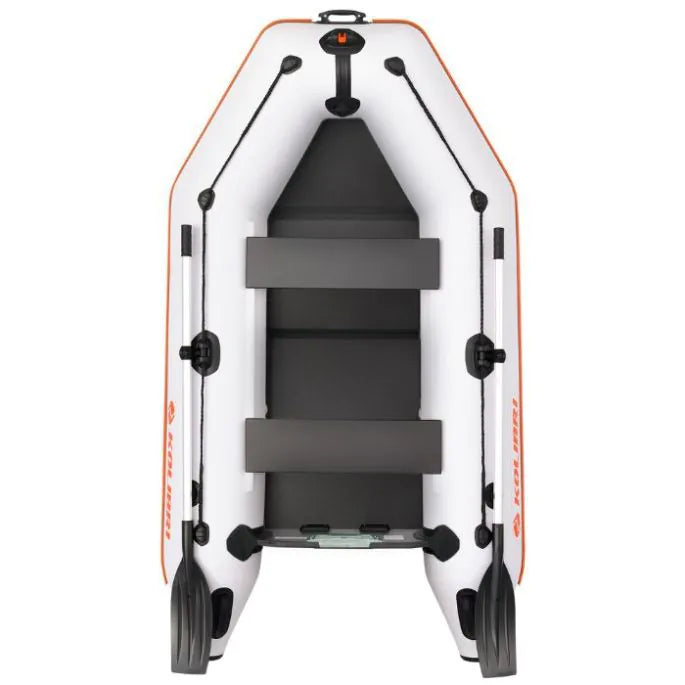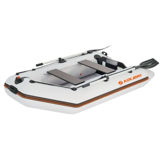 De Kolibri KM-260B Rubberboot is één van meest verkochte rubberboten uit ons assortiment, en dat is niet voor niets. De KM-260B biedt plaats aan twee volwassene en ruim 85KG bagage. De rubberboot wordt geleverd met een stevige boekvloer. De rubberboot heeft een grijze kleur die zorgt voor een moderne uitstraling. De KM-260B is uitgerust met een stevige watervaste houten spiegel die is afgewerkt met een stootvast PVC-profiel. De spiegel biedt plaats aan alle soorten buitenboordmotoren tot een vermogen van 5PK, en dat is veel voor een rubberboot van deze afmetingen.