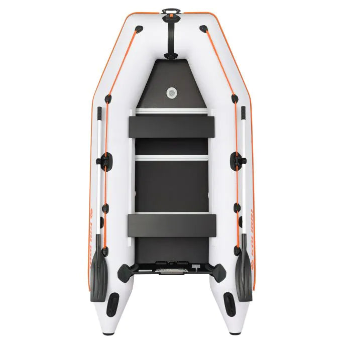 De Kolibri KM-300D is afkomstig uit de Kolibri Professional series. Dat betekent dat de boot is gemaakt van extra dik PVC en beschikt over een opblaasbare V-bodem. Deze bodem zorgt voor bijzonder goed en comfortabel vaargedrag van de rubberboot. Ook zorgt het voor een efficiënt brandstofverbruik. De KM-300D beschikt standaard over een duurzame houten inlegvloer over de gehele lengte van de boot. Hierdoor is de boot erg stabiliteit tijdens het varen. De Kolibri KM-300D heeft grote drijvers van Ø42 cm. Hierdoor beschikt de boot over maar liefst 400 kg draagvermogen.